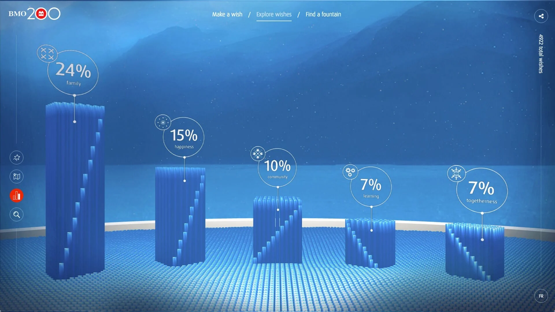 To celebrate its 200th anniversary, BMO teamed up with Mosaic and Thinkingbox to create a stunning waterless fountain covered in 50,000 flip dots. This interactive sculpture allowed people across three countries to toss digital coins and send wishes through their devices, sparking a year-long campaign that brought communities together to “wish it forward”, granting tens of thousands of heartfelt hopes.