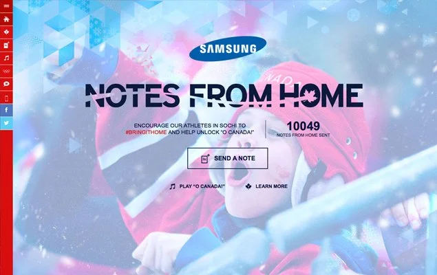 We led the creative for Samsung Canada’s “Bring It Home” Olympic campaign, a celebration of Canadian athletes and the spirit of the Games. Using the Samsung Note, we invited Canadians to share personal messages of support from coast to coast. These notes were collected and brought to life in a dynamic activation, showcasing the nationwide pride fueling Team Canada. My role involved crafting a campaign that connected technology, community, and the Olympic spirit in a way that resonated deeply with Canadians.